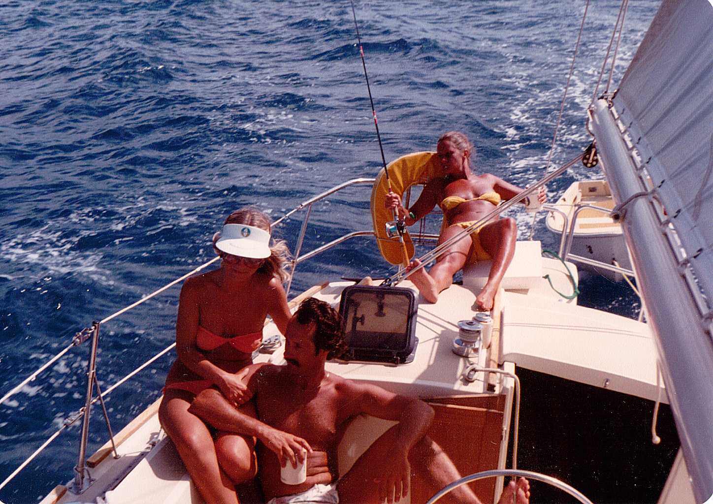 The next morning as we head back toward Tortola the rain that avoided us the night before is close on our heels and Steve and I are busy snapping shots of the dark, but lovely on-coming squall. Too soon it’s upon us and I barely have time to put the camera away before we are heeled over, topsides awash. Kathy is furiously reeling in her fishing line, her bikini top blown down about her waist, while she slides helplessly over the side. I just manage to grab hold of her before she’s washed away, when Steve calls for her to run and get the soap so he can take advantage of this tropical shower. Within fifteen minutes the squall has passed and I have my camera out again. This time I make the crew line up and pose, asking them to look as much as possible like drowned rats. Steve, especially, seems well suited for the task.