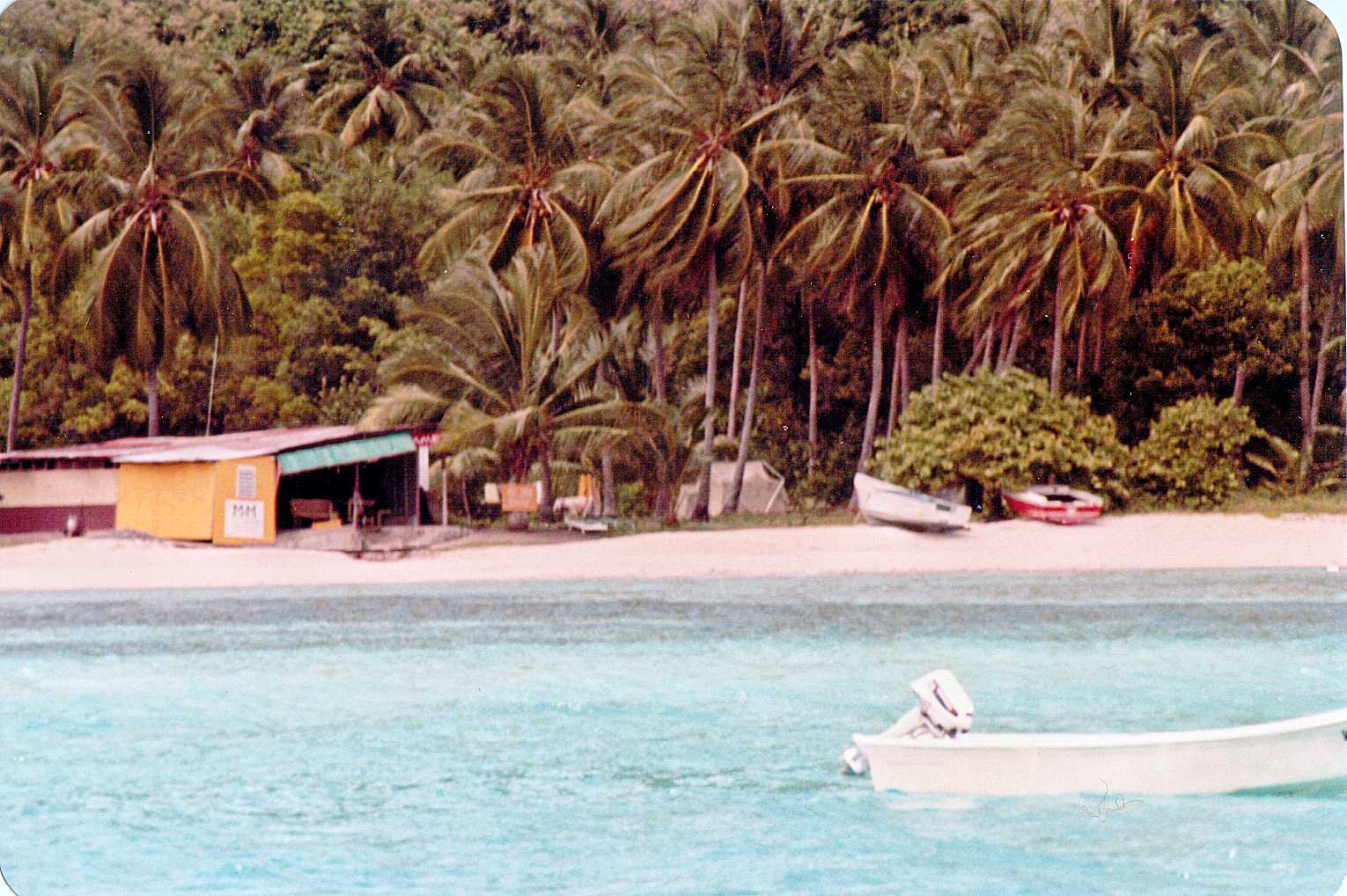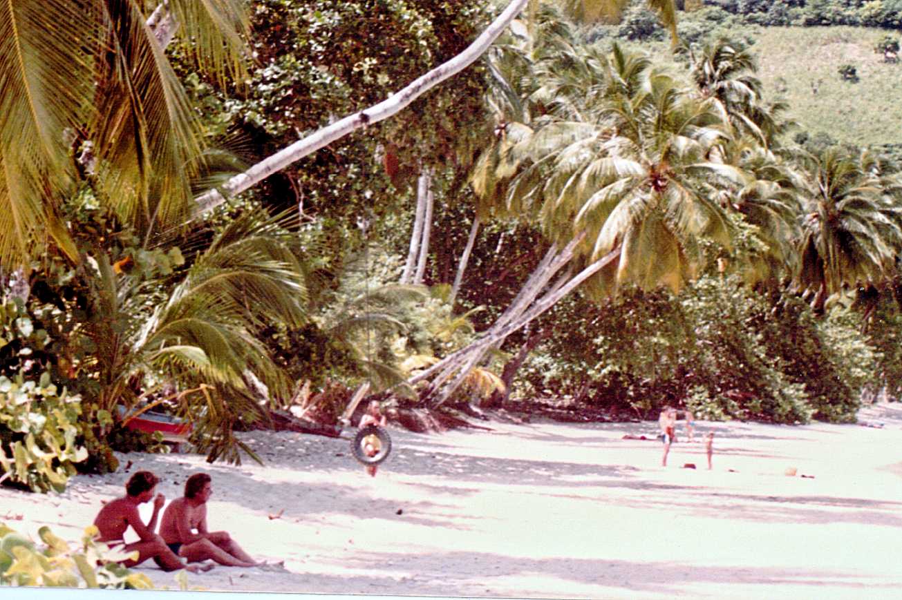 Toward evening, colors grow mute and sound emerges—faint tinkles, soft drumming, a syncopated beat. The two sleepy beach bars are finally stirring and soon a battle of the steel drum bands is in full swing. The hypnotic, calypso music is wafted through the balmy night, across starlit water, luring wayward sailors ashore. In time, we too succumb.