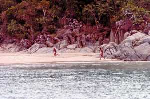 Here the water seems spilt from a paint box—deepest indigo flowing into turquoise, and then rinsing out to a pale sapphire on the soft, white sand—while behind rise groves of palms and steep, forested mountains.