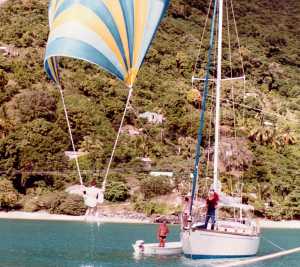 Nearby a boat plays at spinnaker-riding. We watch as the wind catches the brightly colored sail, lifting it high about the mast like a giant kite, while swinging on a line drawn between the clues, a young woman squeals with delight.