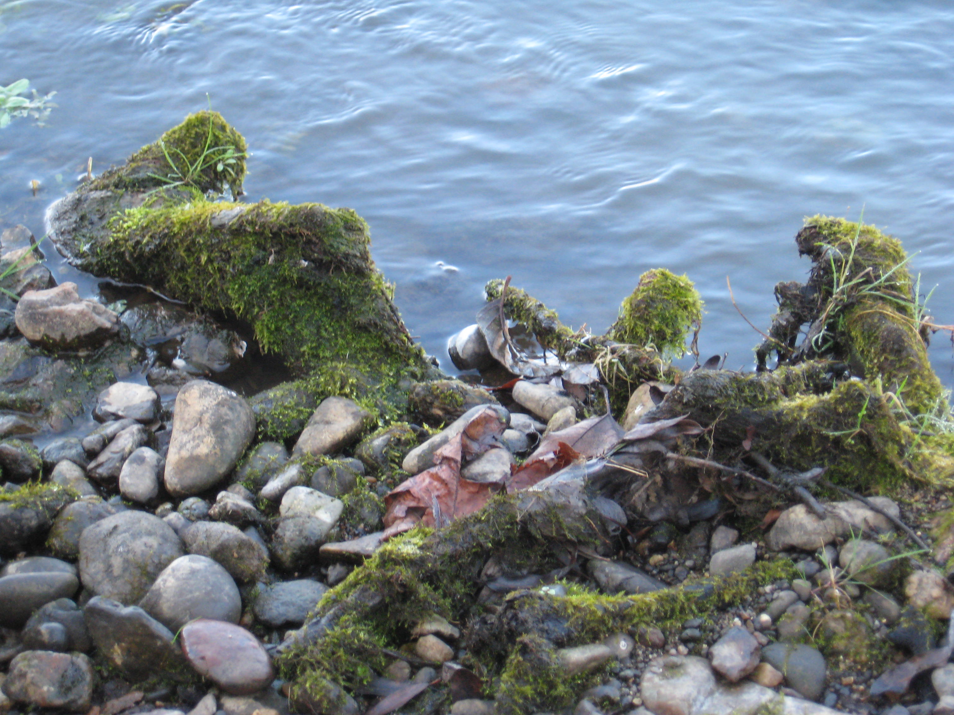 Up close the river is just as pretty–a still life of rock and moss . . .