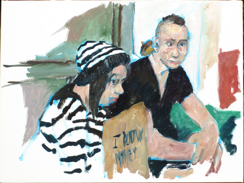 Marc writes: “I do not ask the panhandlers to ‘pose’ for me, but to carry on with their business. I pay each person $10, though I wish I could afford more, because they earn that small fee in the hour or two it takes me to paint them.