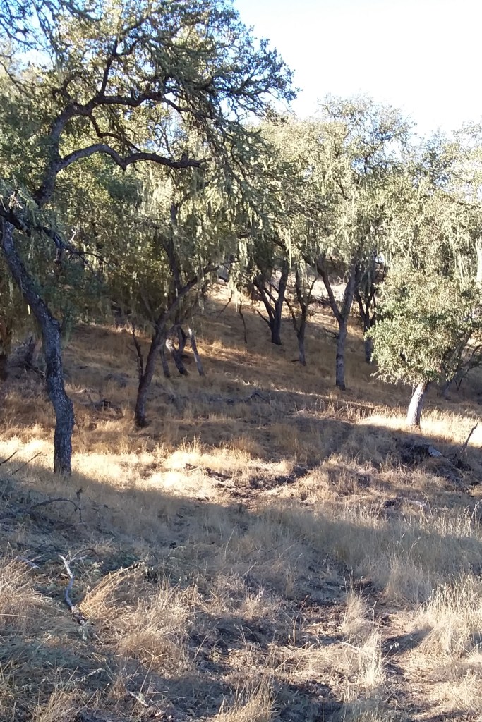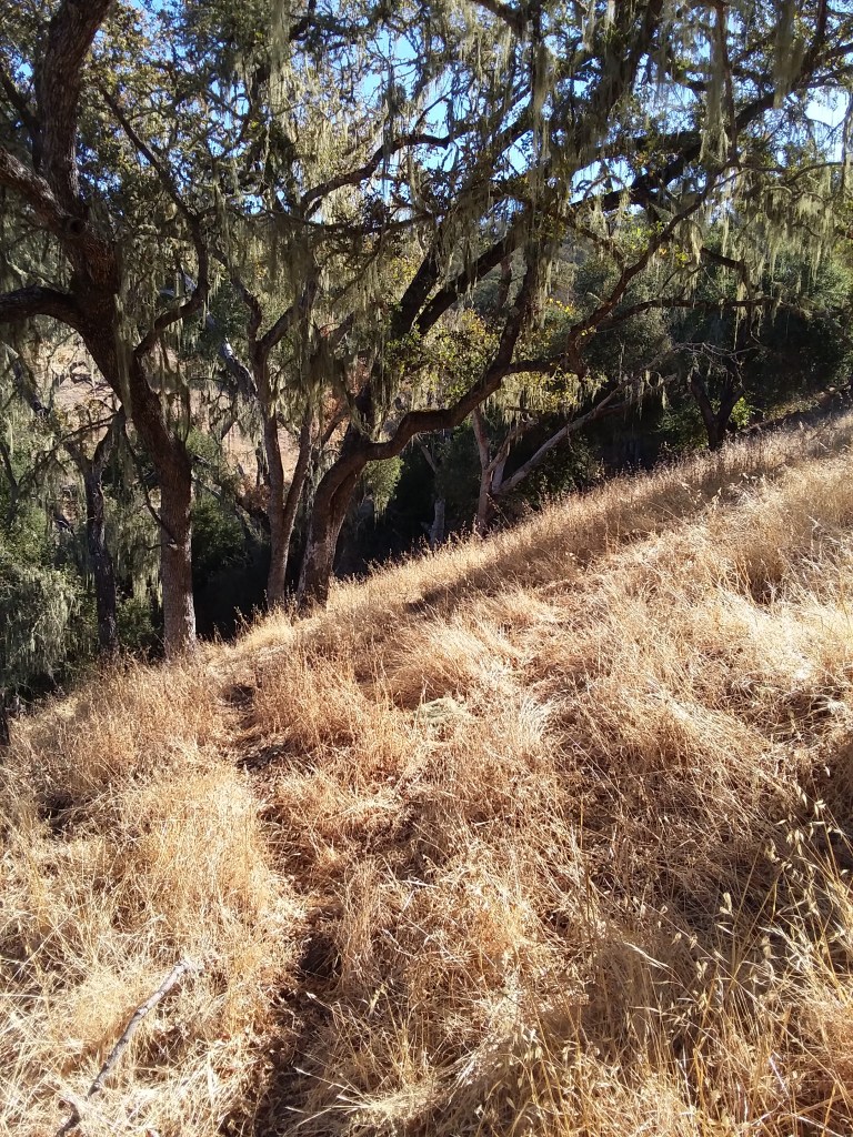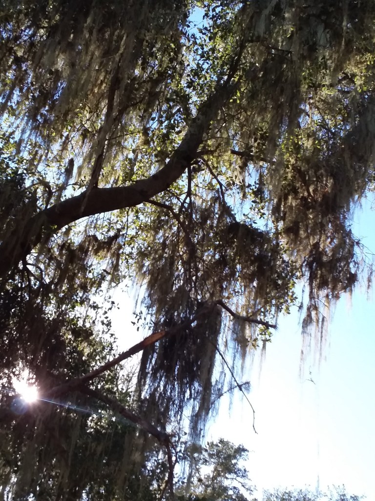 I love these oak trees, the curving branches with their rough bark and soft grassy moss, the dripping branches with their lacy ribbons. The way the sun peeks through . . .