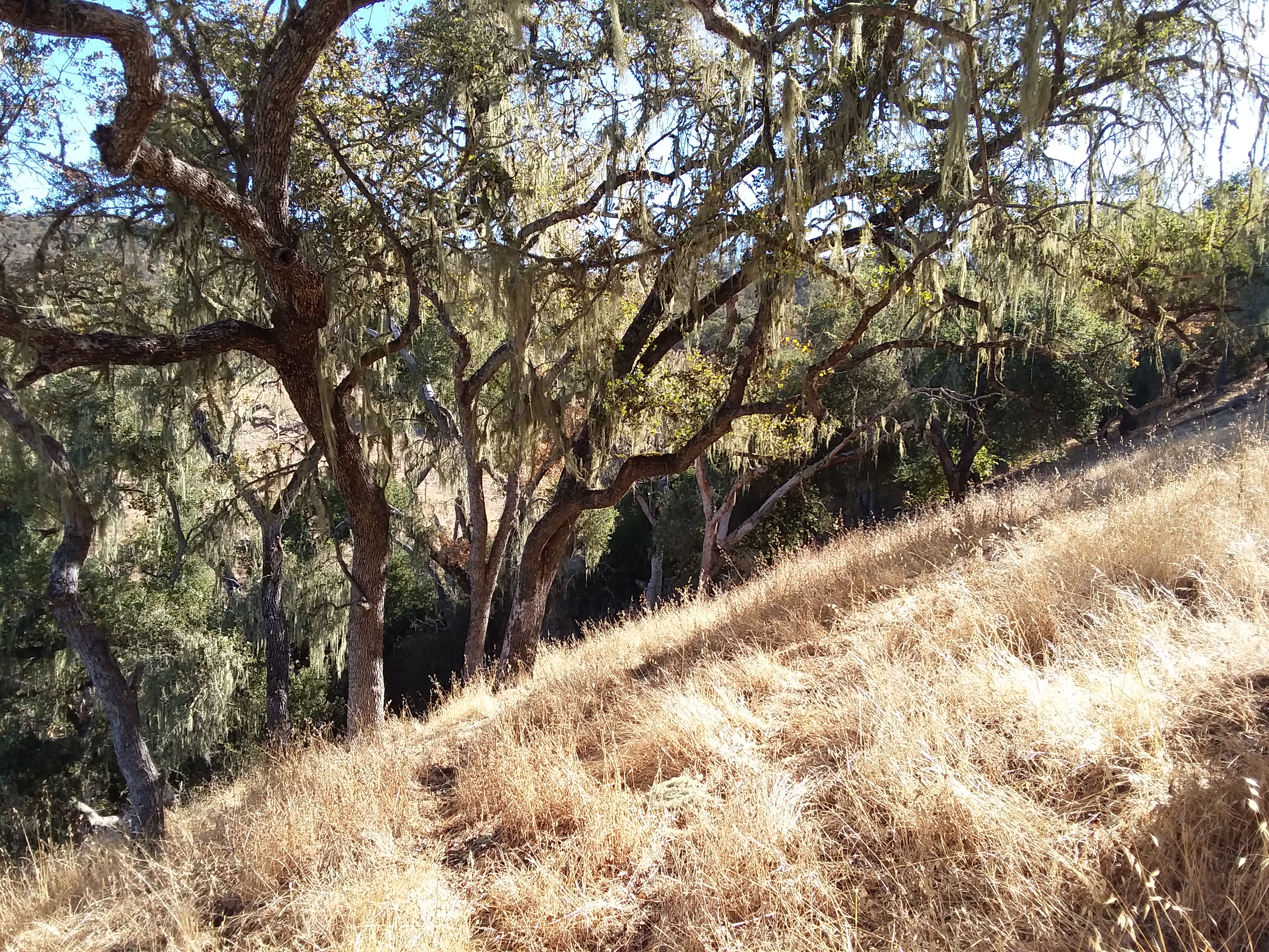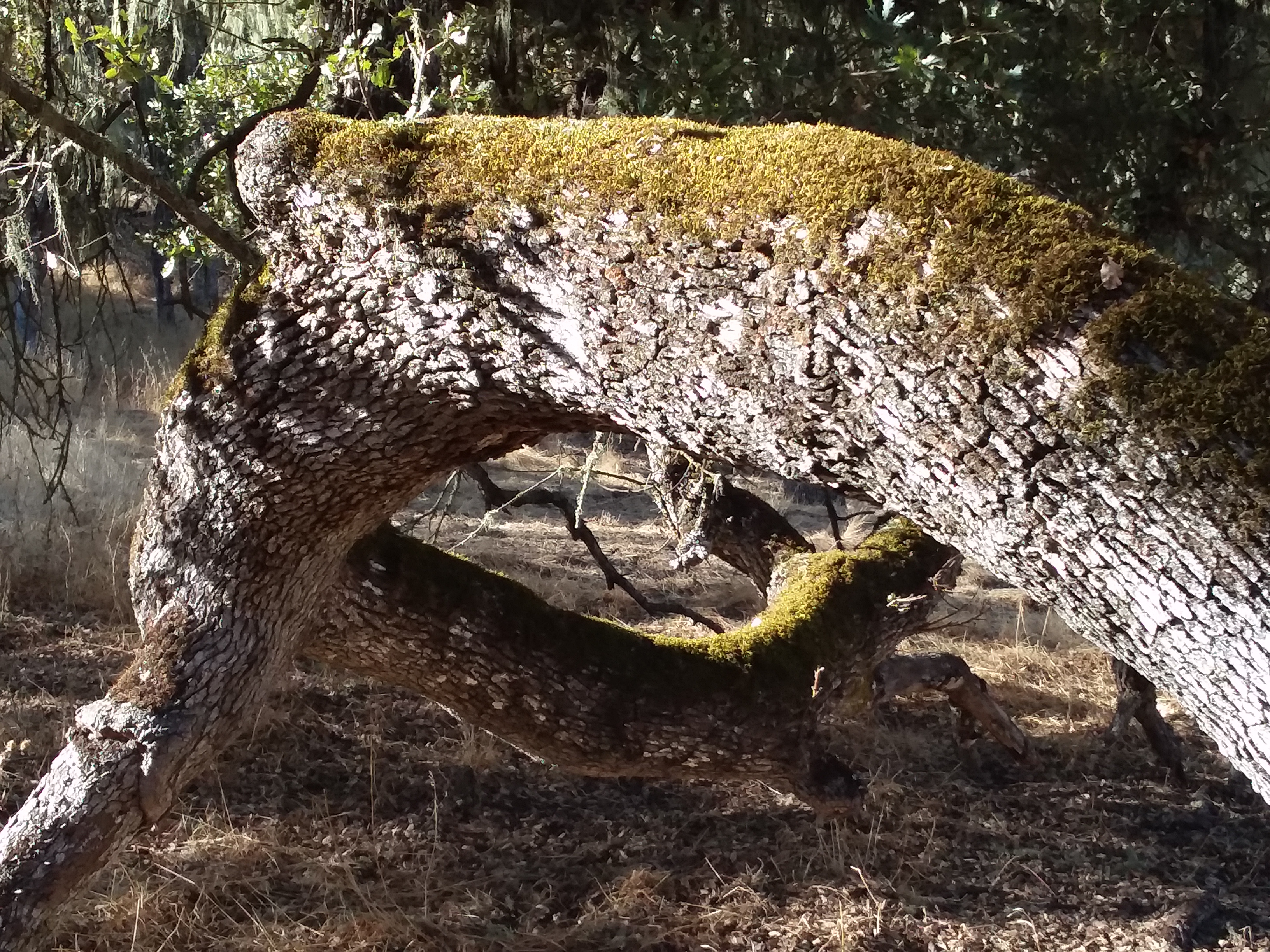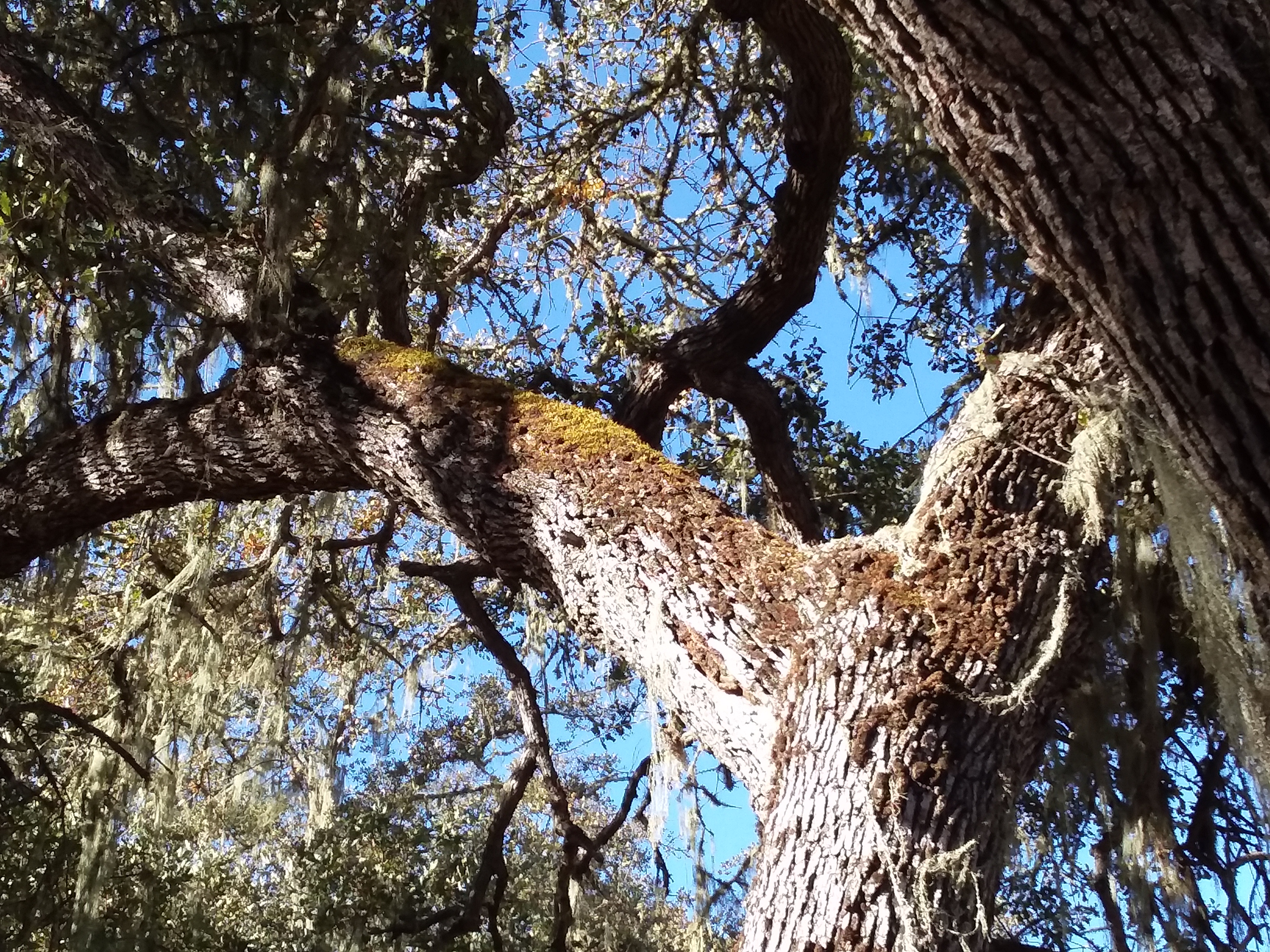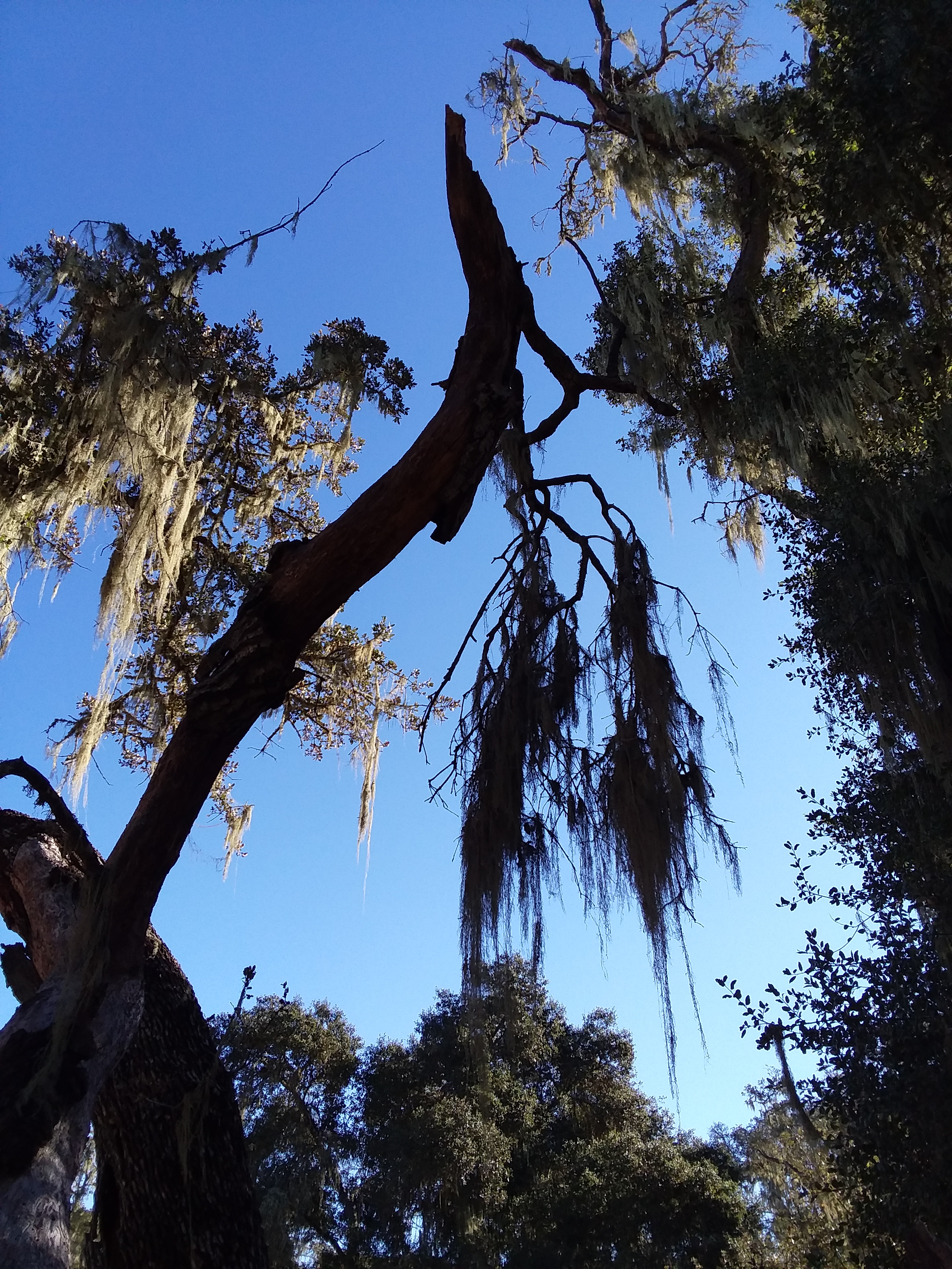 I love these oak trees, the curving branches with their rough bark and soft grassy moss, the dripping branches with their lacy ribbons. The way the sun peeks through . . .