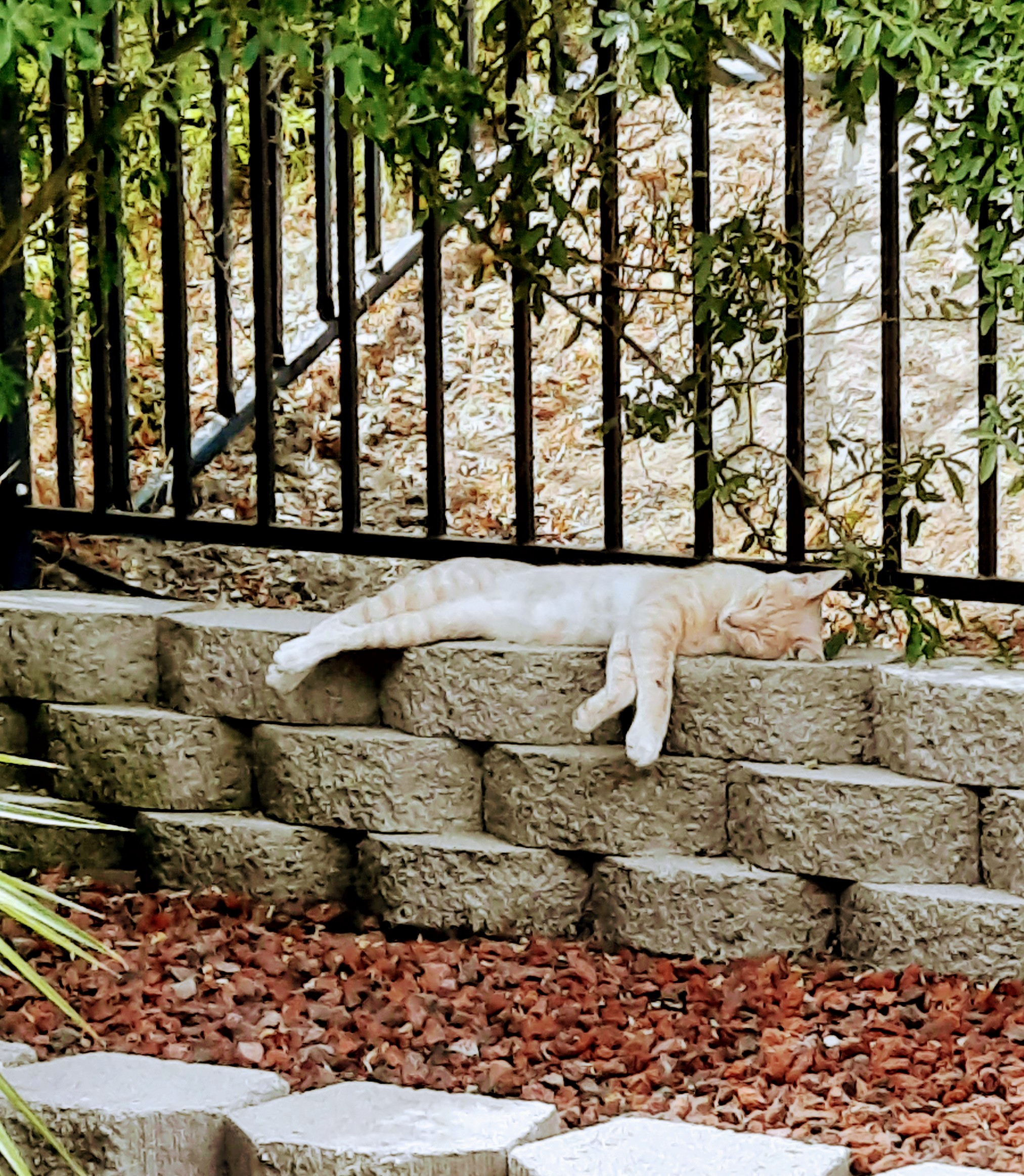 Now that she recognizes us a food source, she hangs out here more often, sometimes grabbing a drink from the pool or the water-can we keep full for her. Sometimes she drinks from the birdbath. She’s found a favorite padded patio chair with a pillow where she likes to snooze. Although a narrow wall will do just as well.