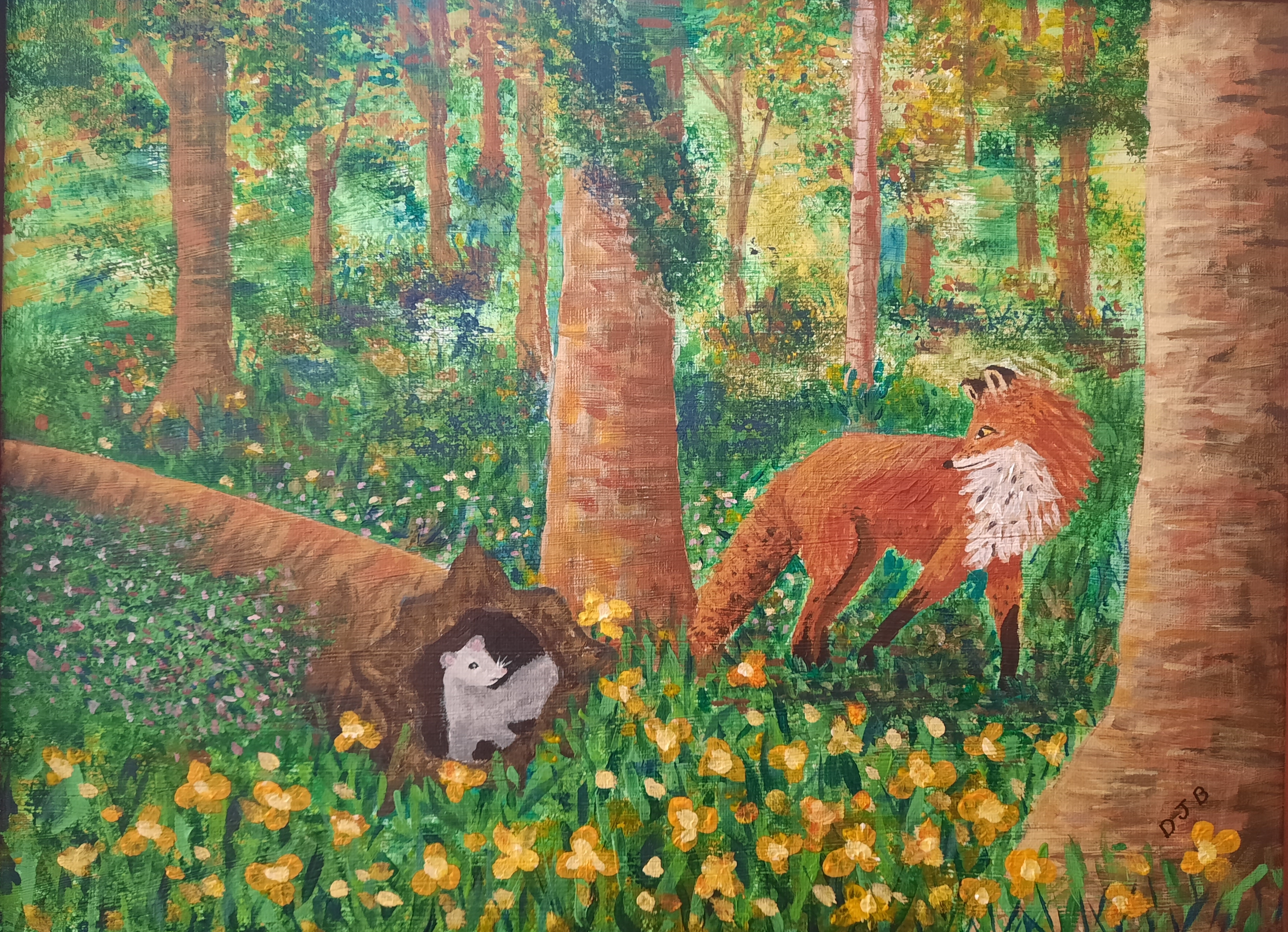 One of the pleasures of painting is creating something special for loved ones. Both of my grandchildren have a special affection for foxes. This one is for my grandson, which also includes a mink because he mentioned how cute they are, having seen a report on how hundreds had escaped (or been recued) from a mink farm.