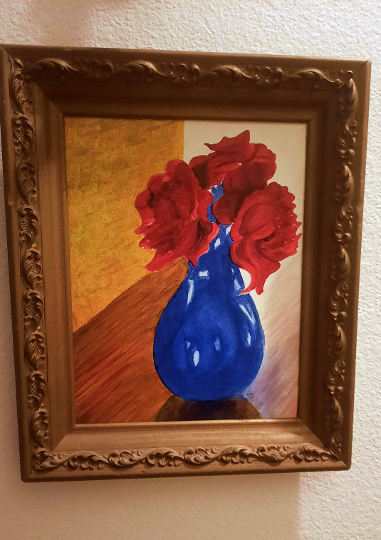 “Red Roses in a Blue Vase”, acrylic by Deborah J. Brasket
