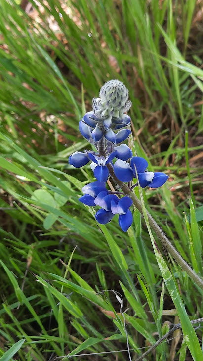 Happy pluvial-induced pleasure to you. Texas bluebonnets have a sort of white cone at their tip, while the lupine you showed here has a little globe atop it.